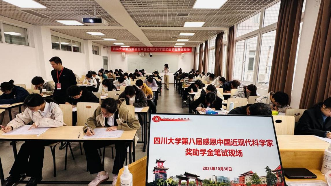 当日上午,笔试环节在望江校区东区第三教学楼正式开启。考题设计紧扣学校治学理念、国内近现代科学家的卓越贡献,以及科学家精神在新时代的价值内涵,全方位考察同学们对榜样人物成就与精神品质的认知深度。考场上,同学们凝神聚力、伏案作答,一笔一划间尽显严谨务实的治学态度;静谧有序的氛围中,折射出川大学子传承科学薪火、勇担时代使命的坚定追求。