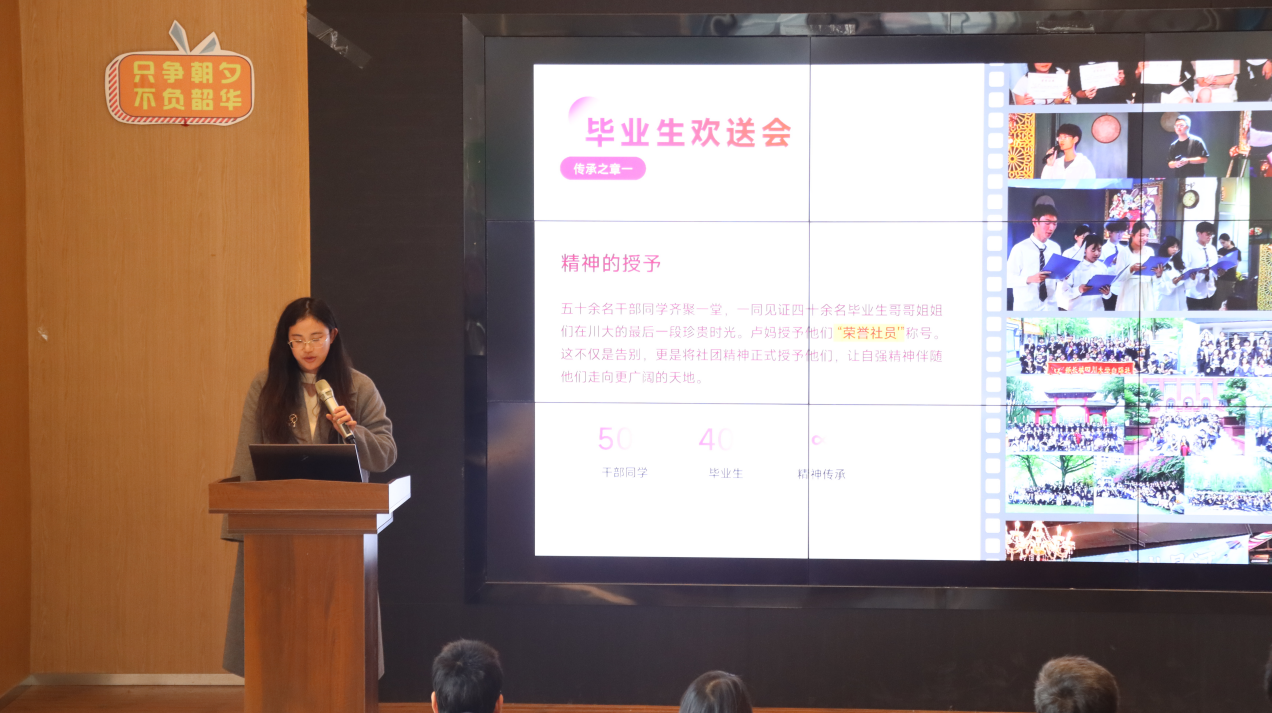 游园会的欢声笑语尚未消散,社庆主场活动已然拉开帷幕。自强社社长粟秋滔作社团工作汇报,以详实的历程回顾换届半年来的耕耘与收获,字里行间满是对社团的赤诚与担当。随后,熟悉的旋律在会场流淌,全体成员齐唱社歌《自强之歌》,“这里有花的芬芳,这里是爱的桥梁”,悠扬歌声如纽带串联起时光碎片,将十七年的坚守与情谊凝结成心照不宣的默契,让每一份热爱在旋律中静静沉淀、回甘。