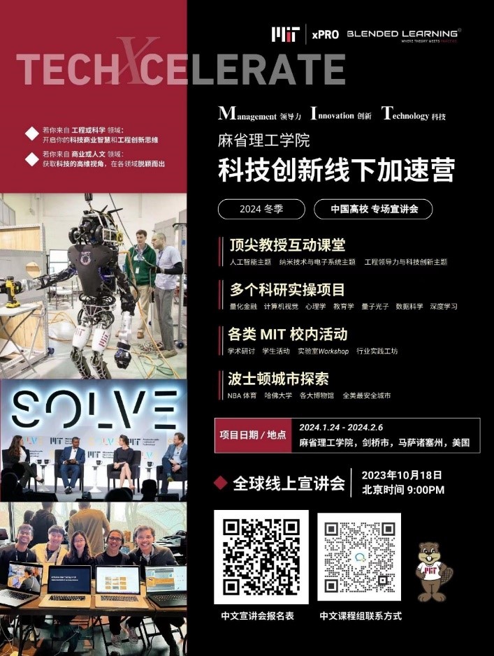 麻省理工学院科技创新线下加速营项目,即Blended Learning MIT TechXcelerate Program,融合了Management(领导力)、Innovation(创新创业)和Technology(科技)三大核心元素,带领学生在麻省理工找寻自己不断学习、创新、成长的原动力。在项目中,学生将有机会深入探索科技前沿、收获学术视野、获得实操技能、积累项目经验、培养创新思维和领导能力。获得校方录取的学生将收到麻省理工学院官方邀请函。项目详情见附件2。