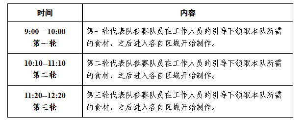 1.本次厨艺大赛由各院系参赛队伍自选菜品,要求在限时60分钟内制作具有家乡特色风味的菜品,食材需普遍易采购,菜品为炒、炸、蒸等热菜,凉菜不作为参赛菜品。后保部饮食中心将根据收集的参赛菜单,结合是否适合在食堂推广为要求,复核各院系推荐的参赛菜单,涉及重复的菜品将沟通调整。本次比赛由专业评委组和大众评委组现场打分评比,获奖参赛作品将纳入食堂菜品推广制作的考虑范围。以下为比赛时间安排表(每轮14组左右)。