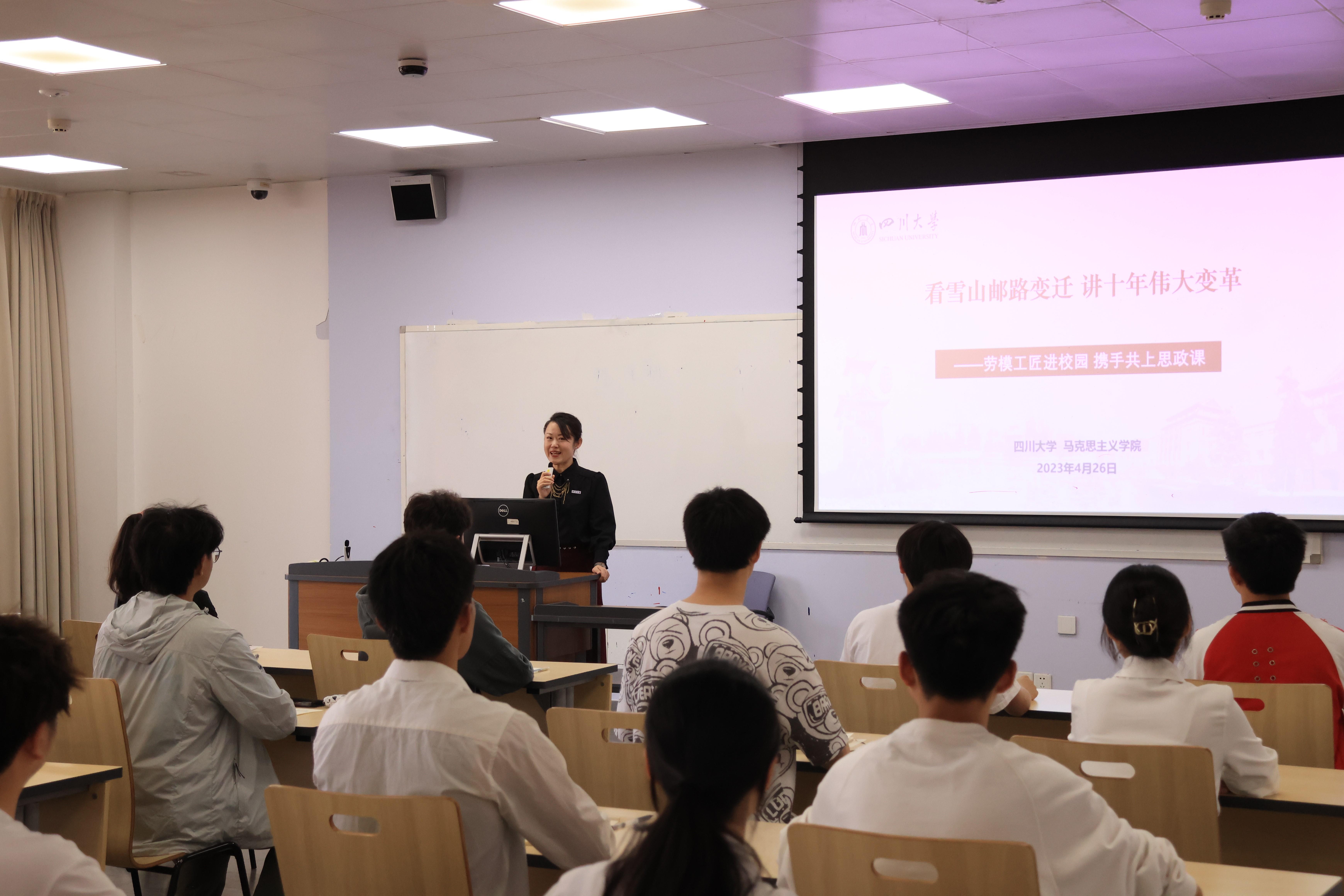 王丽鸽老师则以其美多吉的人生经历为引子,精彩阐述了新时代十年的伟大变革,紧紧围绕“看雪山邮路变迁,讲十年伟大变革”主题进行授课。从身边的劳模工匠先进典型中汲取精神力量,既有活生生的案例,也有系统的阐述,在感受榜样的力量中倾听时代的变革,思政课由小见大的表达,引起了现场学子们的共鸣。江姐班学生邱天谈到,“个人成长和时代发展是相辅相成的,个人成长是时代发展的源动力,而时代发展为个人成长提供了机会。我们要将个人发展融入时代发展中,坚定中国特色社会主义道路,将自我革命融入到社会革命,我们要像其美多吉老师一样发扬钉钉子精神,将自己所学的化工专业知识融入到国家的化工企业,致力于祖国化工领域的发展,注入川大力量。”