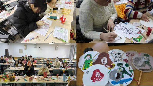观影结束后,潘昱竹同学介绍了团扇的基本知识和文化内涵,讲解了团扇的起源、发展、种类、制作方法和使用习俗,以及团扇所蕴含的寓意和艺术魅力。在潘昱竹同学的指导下,同学们动手制作了传统团扇,用画笔绘制了雷锋同志的画像,并在团扇上书写了对雷锋同志的敬仰之情和对祖国的祝福之词。