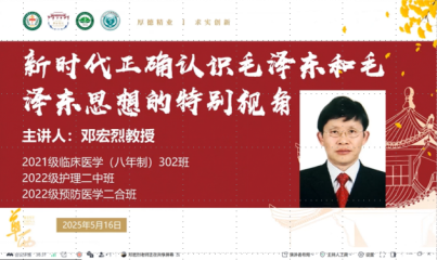 2025年5月16日,华西临床医学院2021级临床医学八年制302班、2022级护理二中班与华西公共卫生学院预防医学二合班三个江姐班联合举办主题为“新时代正确认识毛泽东和毛泽东思想的特别视角”的线上专题讲座,特邀yl7703永利集团马克思主义学院邓宏烈教授主讲。此次讲座旨在了解学习毛泽东思想和其在实现中华民族伟大复兴进程中的重要地位。