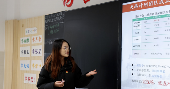 随后,李佳欣同学向学生们详细介绍了“天格计划”,包括其科研目的、研究计划、科研方法以及项目构成等内容。李佳欣同学的全方位展示不仅让学生们深入了解了“天格计划”科研团队的工作,还展现了当代大学生党员积极向上、奋勇争先的精神面貌,传递了“立德铸魂、科创报国”的精神。