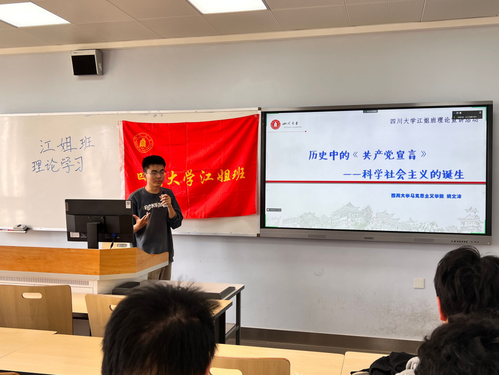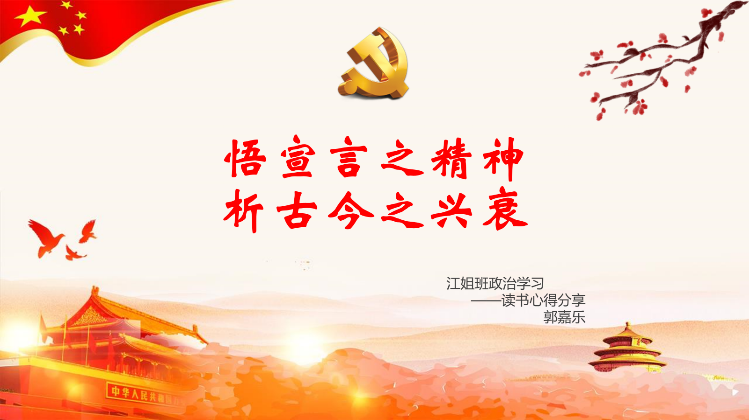 首先姚文沛同学带领江姐班学生进行书籍导读。本次读书会共同研读的书目是《共产党宣言》,姚文沛同学从世界资本主义的发展、自然科学的发展和三大工人运动兴起的背景入手,讲述了社会主义发展的历史条件以及共产党诞生的历程。