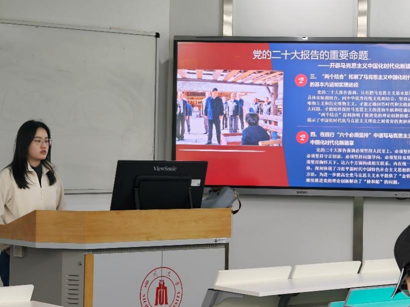本次活动邀请了马克思主义学院江姐班邓璐佳同学进行领学。邓璐佳同学首先谈到本次学习的目的是深化对党的理论创新的规律性认识,坚守理论创新的魂和根,并介绍了马克思主义中国化时代化的重要理论意义和实践意义。接下来,她与同学们一起梳理了新时代马克思主义中国化时代化的根本内容和具体措施,邓璐佳表示,马克思主义中国化时代化是一个重大命题,坚持马克思主义基本原理不动摇是推进马克思主义中国化时代化的前提,科学反映时代精神是推进马克思主义中国化时代化的客观根据。她倡议同学们要积极进行理论学习,自觉主动学,及时跟进学,在学习过程中要将理论同实际紧密结合。