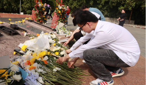 最后江姐班同学齐聚烈士纪念碑前,手捧鲜花,缓步前行。他们深深鞠躬,将花束轻放碑前,表达对革命烈士无尽的敬意与哀思。风中花瓣轻轻摇曳,似乎在诉说着那段波澜壮阔的历史。