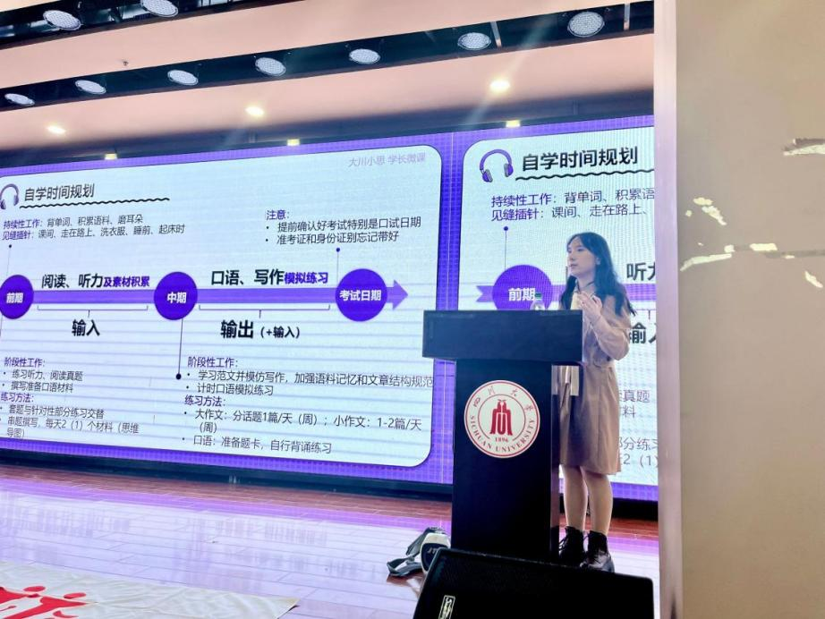 英语组吴佩晔、王亦涵两位主讲小导师分别就冲刺英语四六级考试和备考雅思进行了辅导。她们围绕两类考试的考察核心,重点从词汇积累、听力强化、阅读理解、写作翻译提升、口语表达训练等方面,为同学们提供了切实有效的备考策略。