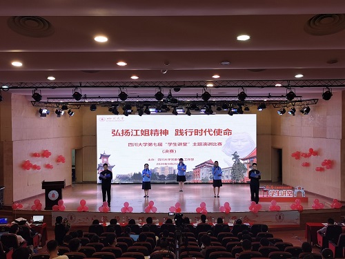 一曲高亢铿锵的《红梅赞》拉开了比赛的帷幕。开场环节,yl7703永利集团思想理论青年研习社的5名同学动情朗诵了《江姐之歌》(节选)。决赛现场,选手们围绕“江姐精神”的丰富内涵,或结合个人求知力行的学业科研和社会实践经历,或联系疫情防控斗争中同龄人逆行请战的感人事迹,共同表达对革命英烈们的深切缅怀和砥砺奋进新时代的坚定信念。来自生命科学学院“江姐班”的杨子霆同学,结合两年来的学风班风建设成效和走访重庆歌乐山烈士陵园的经历,诠释了对江姐精神的真切认知,表达了“科技报国”的远大志向;来自公共管理学院的于世博同学是学校“江姐纪念馆”的一位志愿讲解员,他结合自己的讲解经历,生动的讲述了江姐在川大求学期间隐藏身份、坚持斗争的学习与革命生涯,全方位还原了江姐的铁骨柔肠;来自马克思主义学院的汤茜同学以我校华西援鄂医疗队白衣为甲、壮志出征的战疫事迹为例,联系习近平总书记所归纳的伟大抗疫精神,讴歌了新时代新青年“功成不必在我,功成必定有我”的奉献意识;来自艺术学院的周煜瑶同学身着一袭素色旗袍登场,用低吟耳语般的声线,以当年江姐就读时的学号和自己的学号,串联起跨越时空的情境对话,呼吁青年一代勇担重任,争做时代江姐;来自空天科学与工程学院的陈舒浏同学以自身航空航天工程专业背景入题,论述了在江姐精神的感召下练就过硬本领、突破技术壁垒,做敢斗争善斗争的青年战士的重要性......比赛间隙,还进行了红色知识问答以及“微信墙”抽奖,主持人与观众们踊跃互动,现场氛围热烈而融洽。
