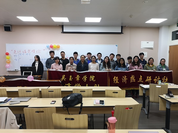 参与分享的6位同学分别对2015年到2019年间诺贝尔经济学奖得主的科研成长经历进行了介绍,生动形象地展示了他们的研究领域、获奖成果以及对中国经济发展的影响。李旸老师结合海外求学的亲身经历,细致梳理了经济学与数学的密切关系,鼓励大家养成运用数学公理推导经济学理论的思维习惯和利用模型结构来解释经济学现象的学习方法。王雅梅老师结合自身科研经验,对经济学诺奖得主研究成果进行了深层分析,劝导同学们注意观察现实生活中的经济学现象,学以致用。活动尾声,两位老师发出倡议,希望同学们学好专业知识、练就扎实本领,为国家未来经济发展和国力腾飞贡献自己的力量。