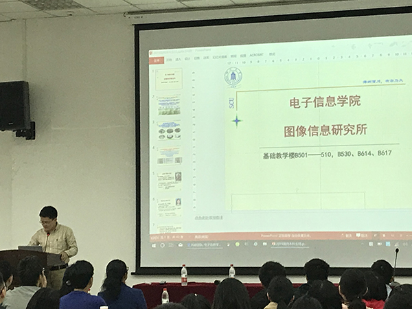 本次动员会共邀请了学院9个研究所的带头人。他们分别从各自的研究方向、研究成果、团队人才培养几个方面做了简要介绍。其中,院长冯国英教授和图像信息研究所卿粼波副教授讲述了各自研究生的课余生活,如开展各种健身活动、组织各种才艺表演晚会等;副院长黄卡玛教授和张启灿教授以个人求学生涯为例,解答了同学们关于如何选择研究生研究方向的问题,并鼓励同学们积极探索,勇敢面对人生的挑战;何培宇教授以麦克风阵列为例,介绍了她们研究组对声音信号的研究;李大海教授以同学们都很熟悉的反射定律为基础,从光学基本概念出发,将他们研究所的研究方向介绍得更易于同学们认识和了解;钟哲强讲师的介绍言简意赅,使同学们对激光技术的应用有了更进一步的认识;杨晓敏教授以一部科幻片生动地解释了视觉增强的概念,表达了对同学们期待。