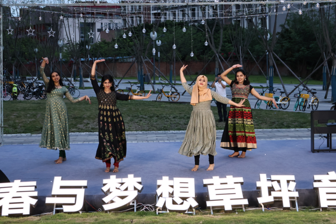 现场氛围十分热烈,更有留学生们带来的印度舞《semiclassical freestyle fance》。演出最后以《错位时空》《有我》两首歌曲的大合唱作为结尾。在演出中,还设置了两轮抽奖环节,现场同学们踊跃参与互动,整个草坪音乐会气氛热烈,让在场观众深刻感受到到浓厚的校园文化艺术氛围。
