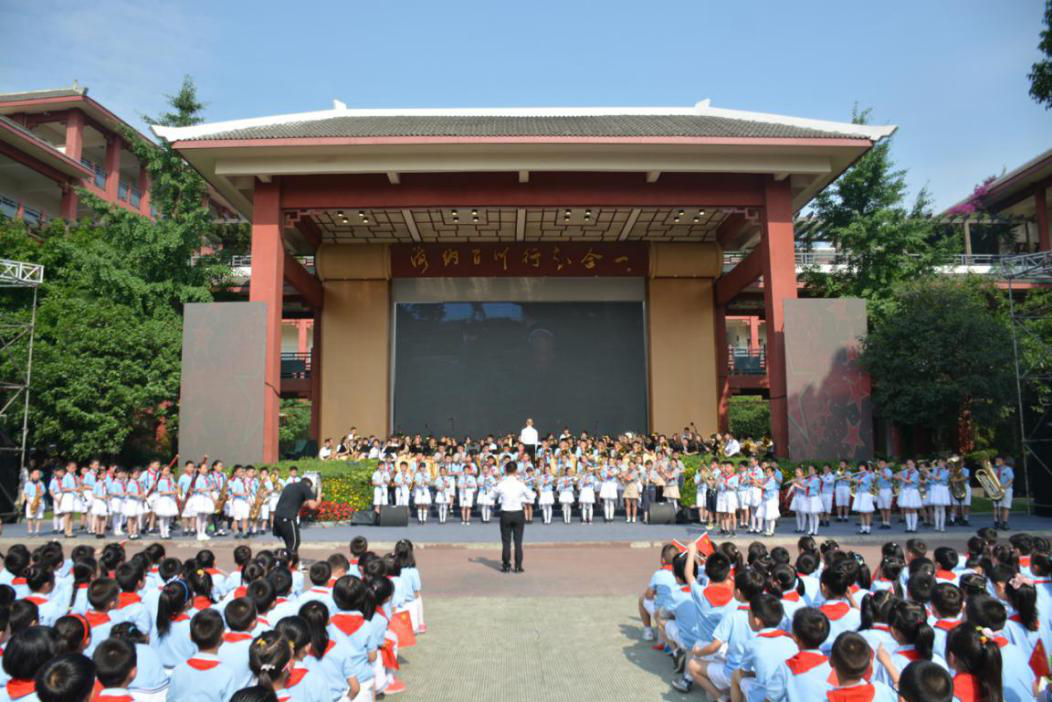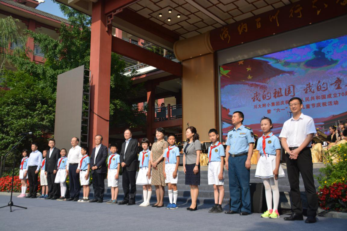 5月31日上午,yl7703永利集团附属小学教育集团举行“我的祖国 我的童年”庆祝中华人民共和国成立70周年暨“六一”国际儿童节庆祝活动。成都市武侯区、yl7703永利集团、yl7703永利集团附属小学教育集团等单位领导来到现场,和孩子们共度六一儿童节。来自yl7703永利集团学生艺术团“大川文艺轻骑兵”队伍,为川大附小的师生送去管乐合奏节目《红星闪闪》和音舞剧《追寻》。