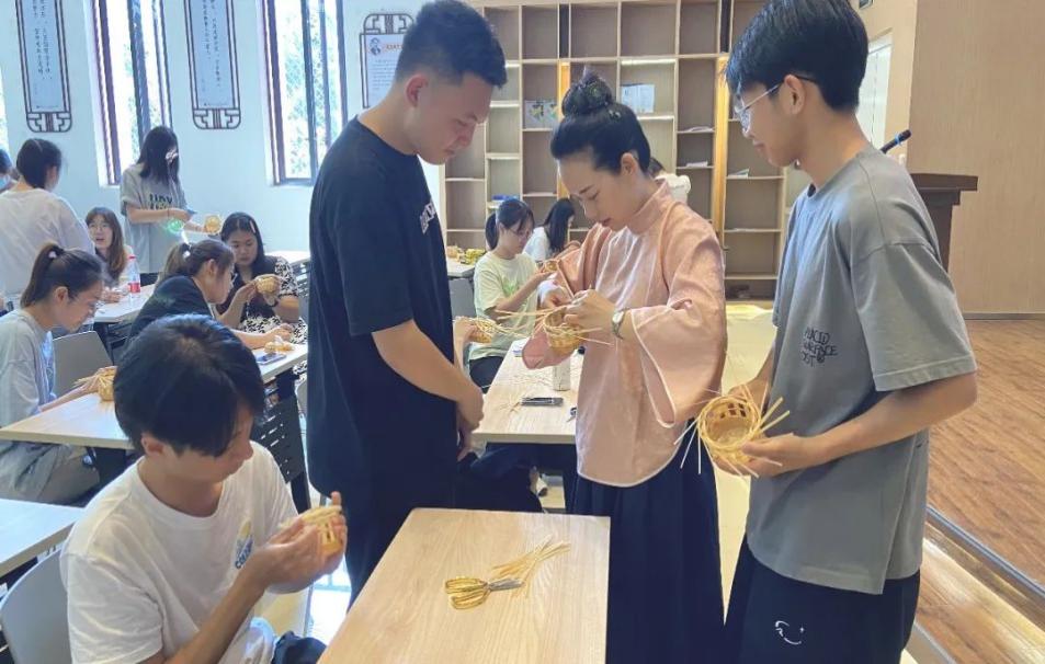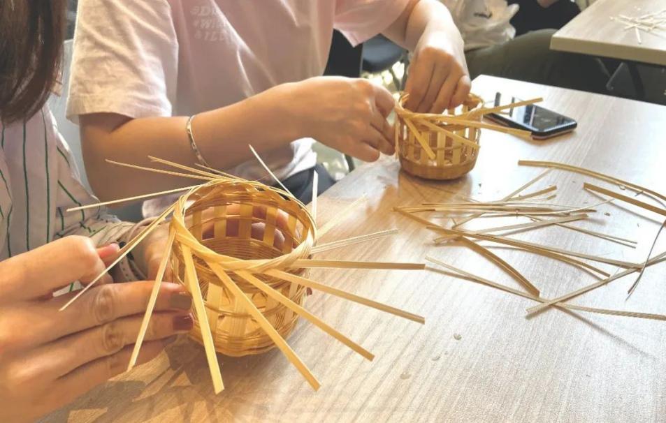 随后,杨老师现场教学编织彩条花篮,“挑二压二”的编法展现了传统技艺的魅力。同学们细心观察细节,零基础亲手体验,彩色竹丝一经一纬、一挑一穿,编出个性化创意。