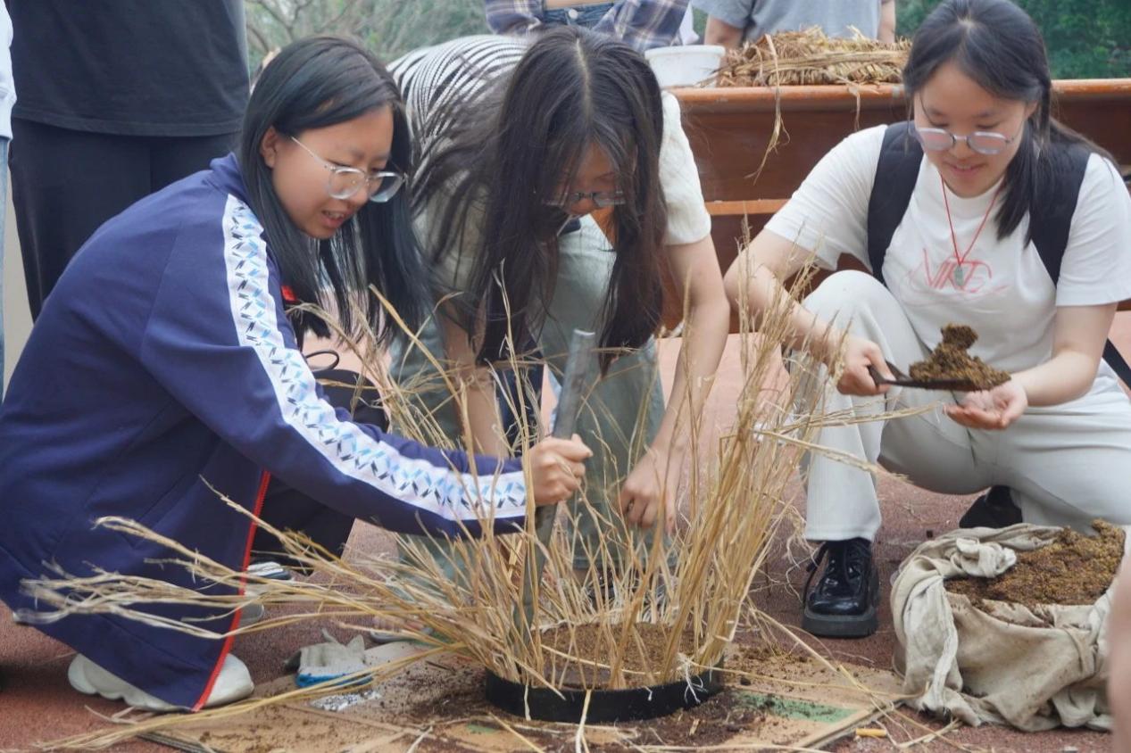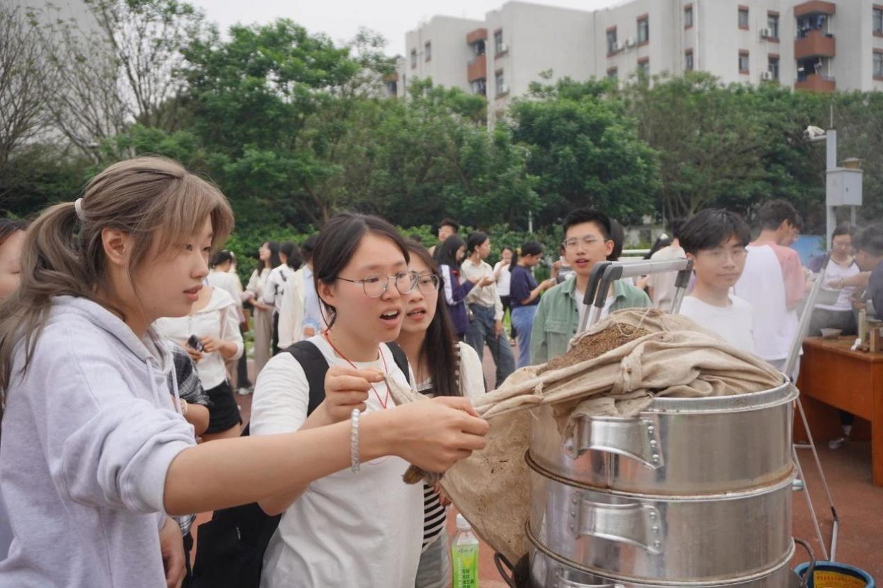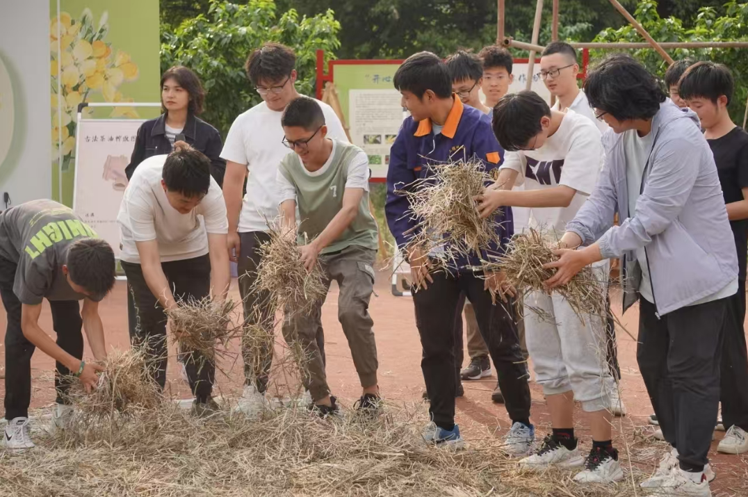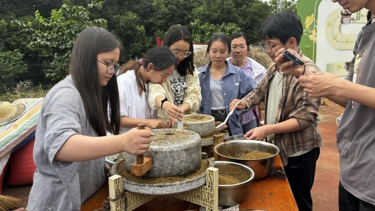为了满足同学们对“油菜籽如何变成菜油”的期待,“开心农场”还引入传统农具,搭设“古法榨油”作坊,还原全链条的工艺流程,让同学们“沉浸式”观摩和实践制作过程。