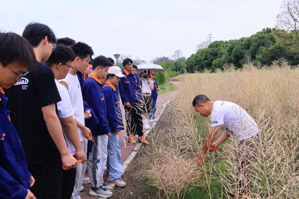 “俯下身,左手把住油菜茎底端,右手握住镰刀用力向上一拉,茎秆轻松就被割断了。”实践指导老师耐心为同学们示范操作。