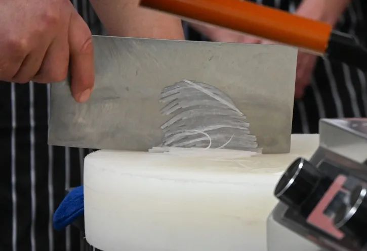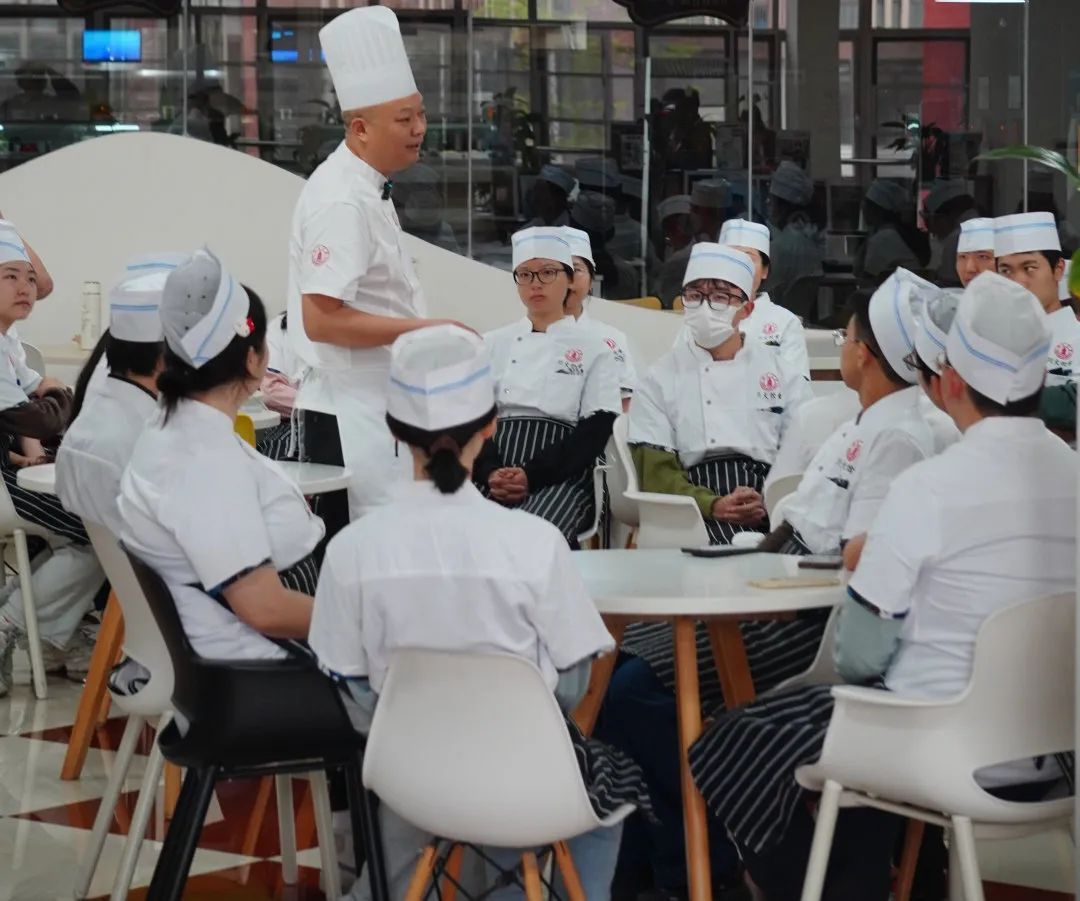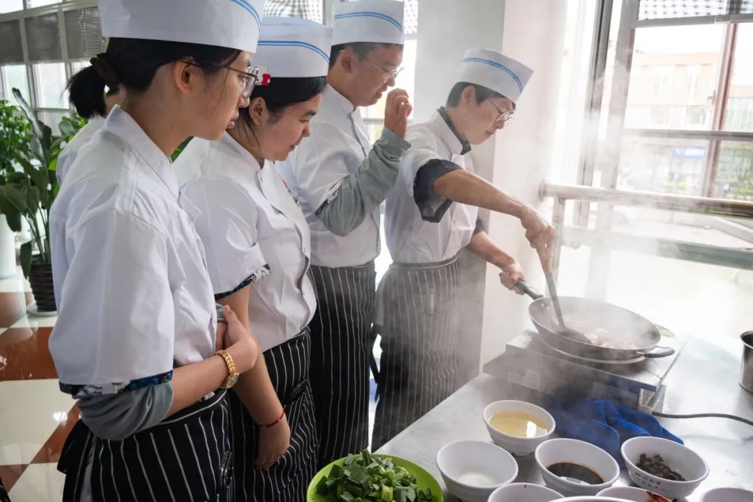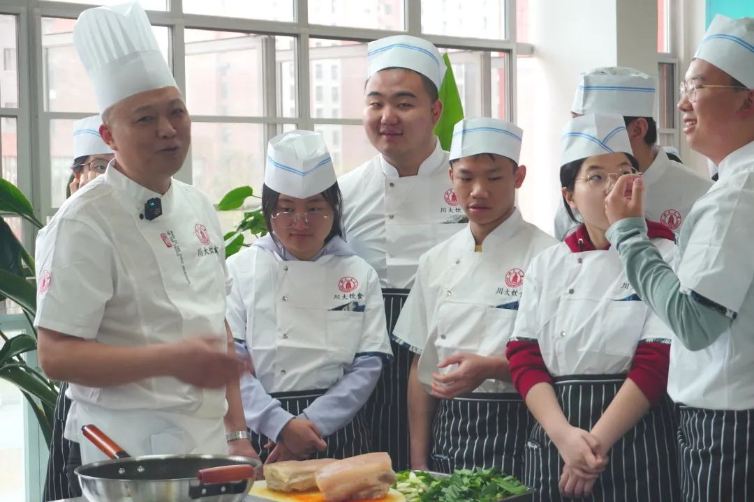 接下来是川菜扛把子——回锅肉!“五花肉要肥瘦相间,层次分明,那是回锅肉‘灯盏窝’成型的关键”,杨胜容细细讲解菜肴制作要点。同学们围在操作台前,眼神专注,认真学习。