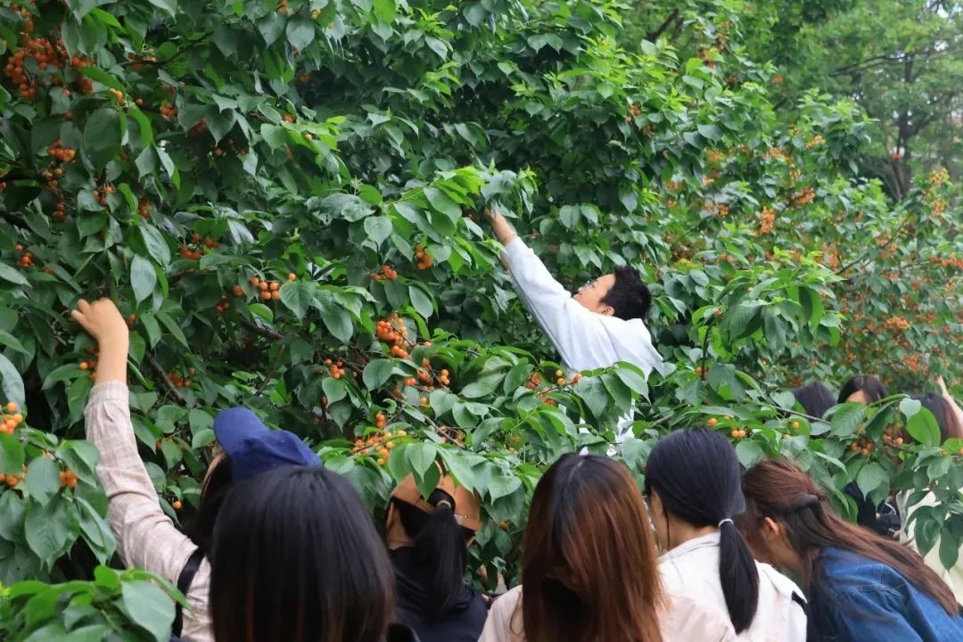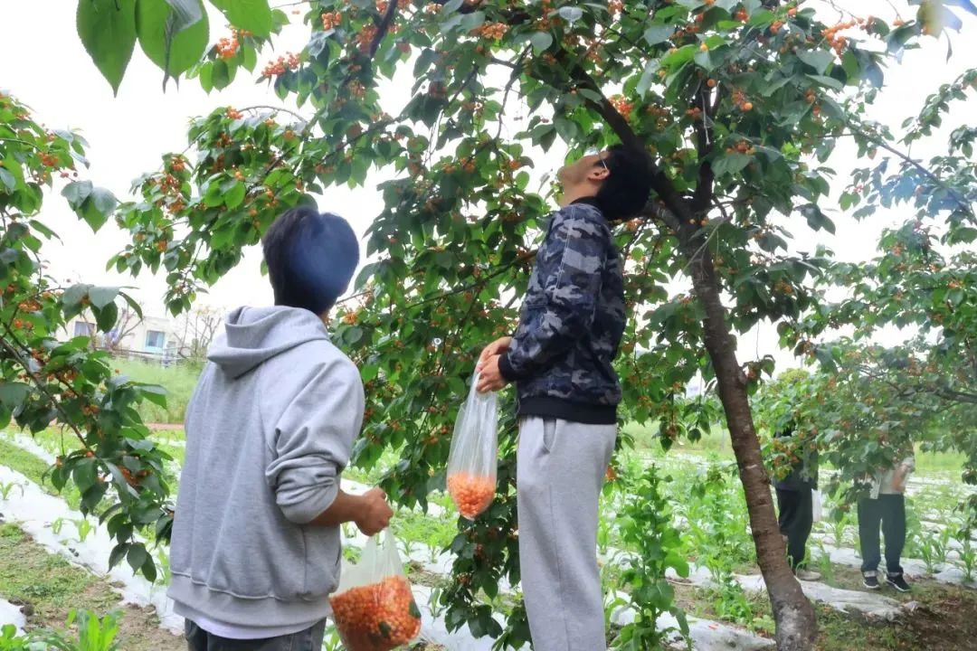 渐渐的,同学们掌握了采摘技巧,踩着梯子爬上高处,盯着枝头颜色红润、个头饱满的果子,边摘边尝,不一会儿小口袋盛满了大大小小的果实,分分钟实现“樱桃自由”。