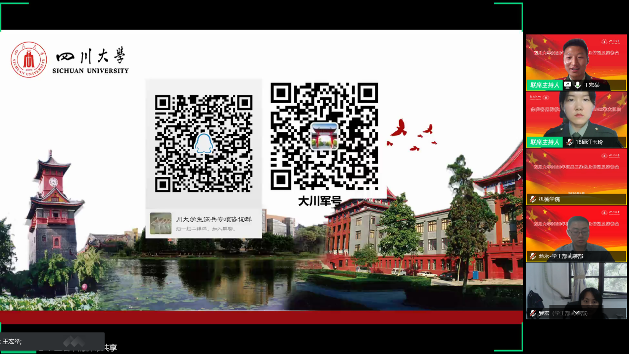 为积极推进我校征兵工作深入开展,4月30日,学校征兵工作站举行了2020年征兵工作线上培训及咨询会,学校征兵工作站工作人员、各学院征兵专员、退伍大学生士兵以及有志于参军入伍的学生一百余人参加了会议。