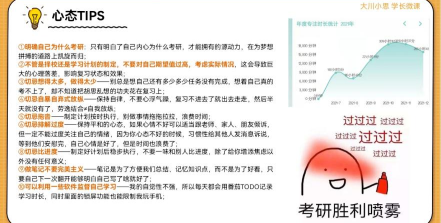 最后,吴子馨同学分享了考研TIPS,这也是备考同学关注的重点。关于英语和政治,导师重点分享了一些应试技巧、自己的错题记录方法、教学视频的使用方法等,如政治1000题的刷题表格,非常方便多次练习以及总结分析。除了英语TIPS、政治TIPS,导师还分享了关于考研心态的TIPS。导师总结归纳了十条小技巧,帮助同学们明确考研目的;合理规划备考复习时间和进度;调整好心态,结合实际制定期望值,不与同学比进度;借助手机APP“番茄TODO”提高自律性。