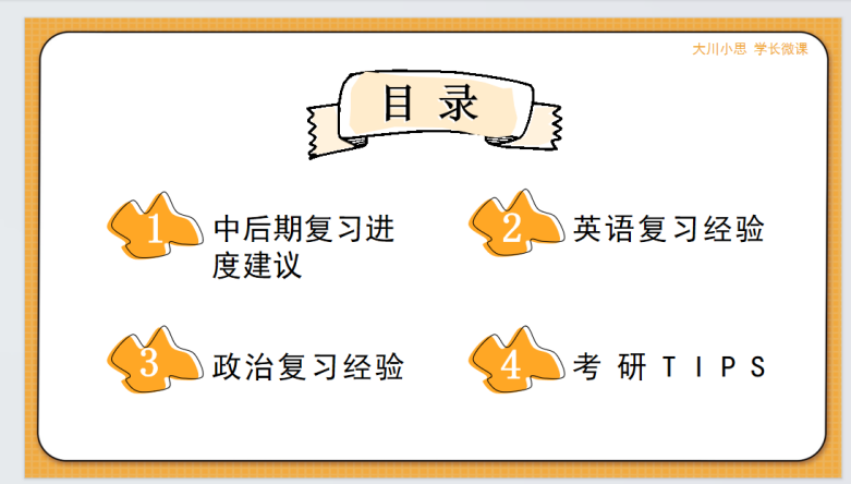 接着,她分享了政治复习的经验。与英语备考中后期时间安排不同的是,导师将备考中后期政治复习的时间安排分为三个阶段,9月前第一阶段她建议重点听辅导课和做1000题,并认真总结,梳理重难点,11月中旬前的第二阶段要进行错题总结,反复记忆巩固重难点知识,11月中旬后的最后时段背诵肖四的同时要全面在复习内容、答题技巧上下功夫。她分享了政治复习书籍、学习视频和公众号,并就日常咨询辅导过程中的常见问题进行了汇总解答。她强调,学习习惯各有不同,同学们找到适合自己的复习方法最重要。