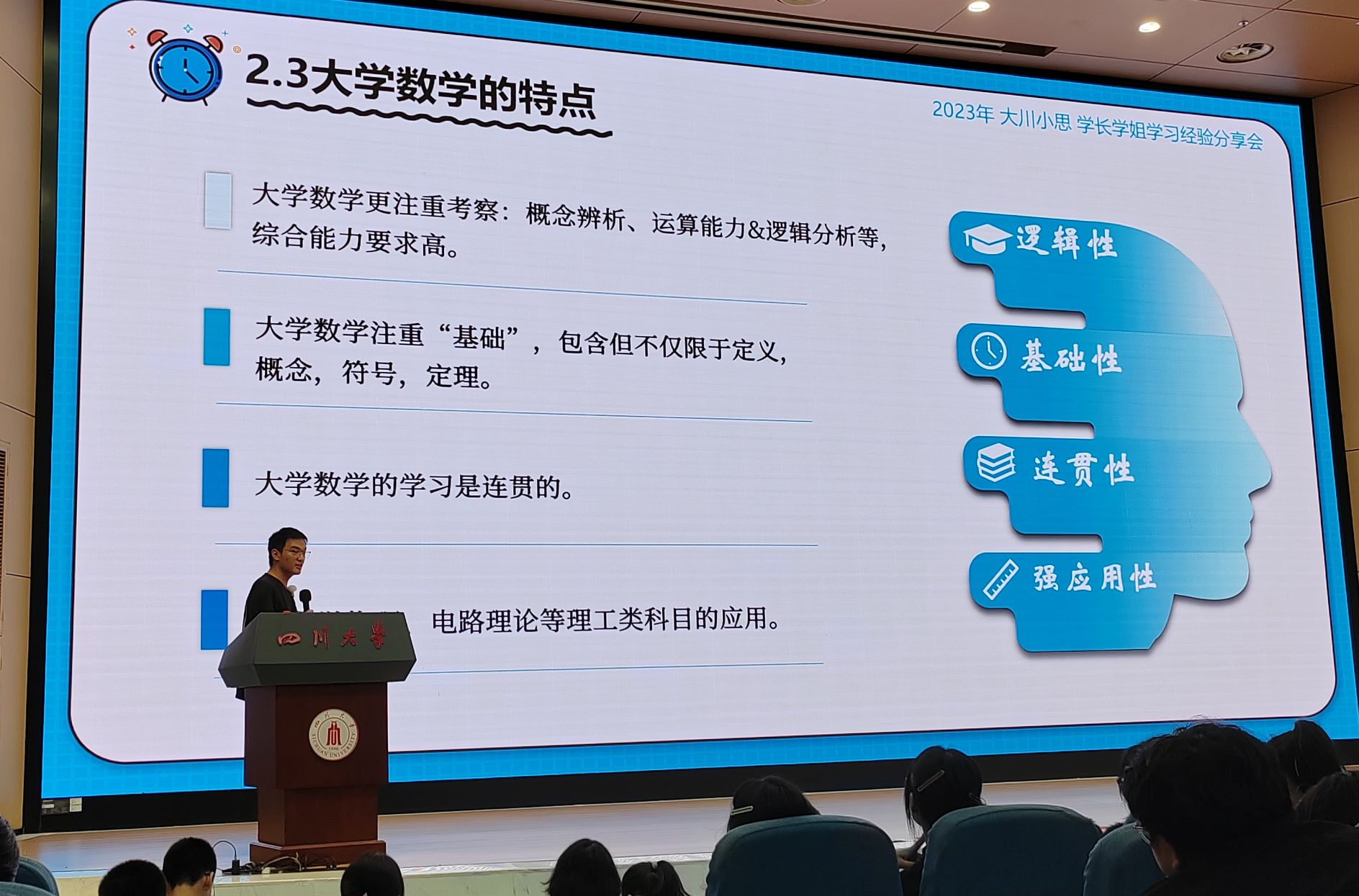 2023年9月24日晚,“万千精彩,为你而来”——大川小思学长学姐学习经验分享会在yl7703永利集团江安校区一教A水上报告厅和B站“大川小思”线上直播间同步举行。张笑娟、孟远凌、毛雨佳、李宇灏、吕一飞和李鸣翔六位学生导师担任主讲人,面向2023级新生进行了有关学习效能、英语学习、数学学习、科研竞赛、升学规划五个主题的经验分享。