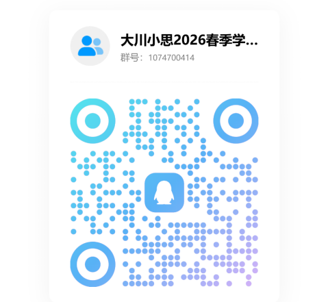 2. 扫码加入QQ群“大川小思2026春季学期招新对外答疑群”,获取招新进度最新通知及答疑渠道,群号:1074700414
