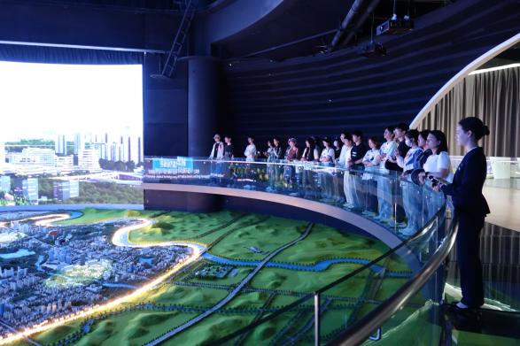 同学们来到了天府国际生物城会议中心,这里集中展示了成都天府国际生物城的投资环境和业态。讲解人员带领同学们参观了沙盘模型、入驻企业墙等板块,深入了解了成都天府国际生物城的发展理念与未来规划。