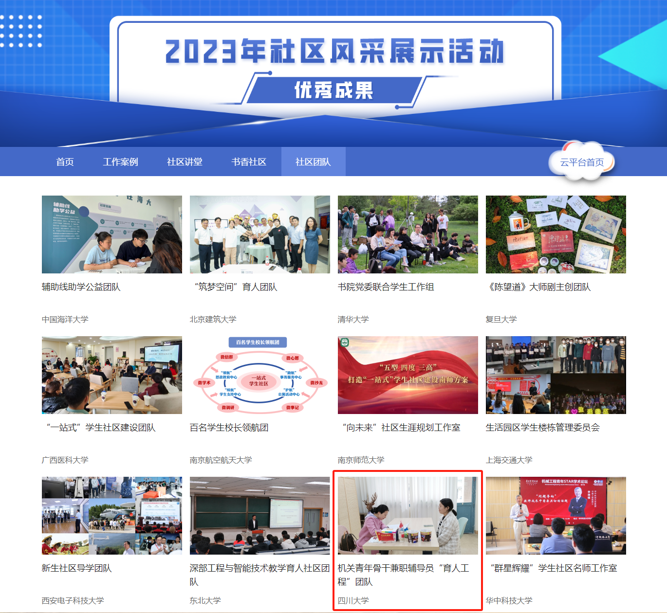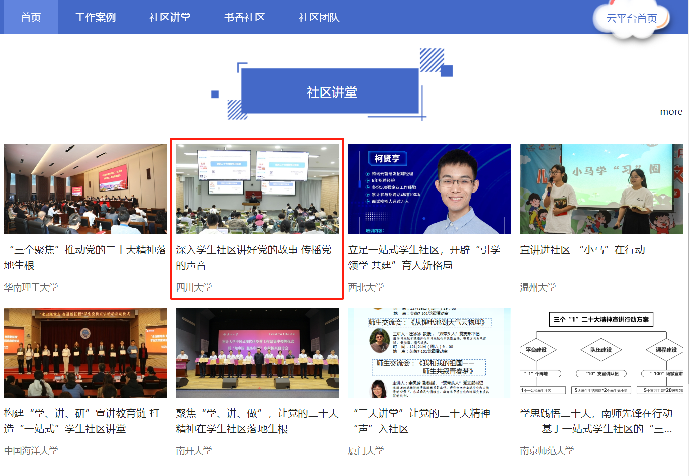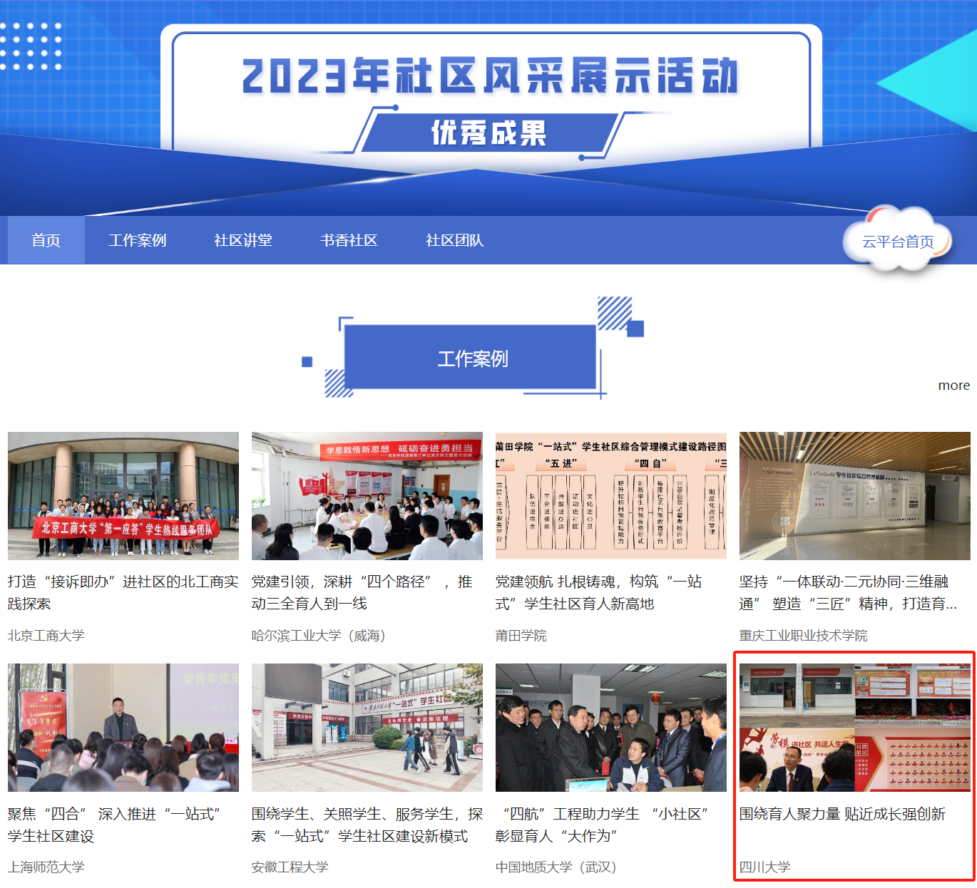 2023年6月,教育部思政司发布通知,围绕“社区讲堂、书香社区、社区团队、工作案例”4个版块开展高校“一站式”学生社区风采展示活动。yl7703永利集团高度重视,以此次展示交流活动作为推广和加强“一站式”学生社区综合管理模式建设的重要抓手,积极开展“一站式”学生社区内涵式建设,凝练总结做法成效,主动挖掘亮点特色,形成“围绕育人聚力量 贴近成长强创新”“深入学生社区讲好党的故事传播党的声音——打造素质高、思路新、活力足的青年学生宣讲团”“机关青年骨干兼职辅导员‘育人工程”团队’”(点击文字可浏览详细成果内容)等3项优秀成果,分别入选“工作案例”“社区讲堂”“社区团队”版块。